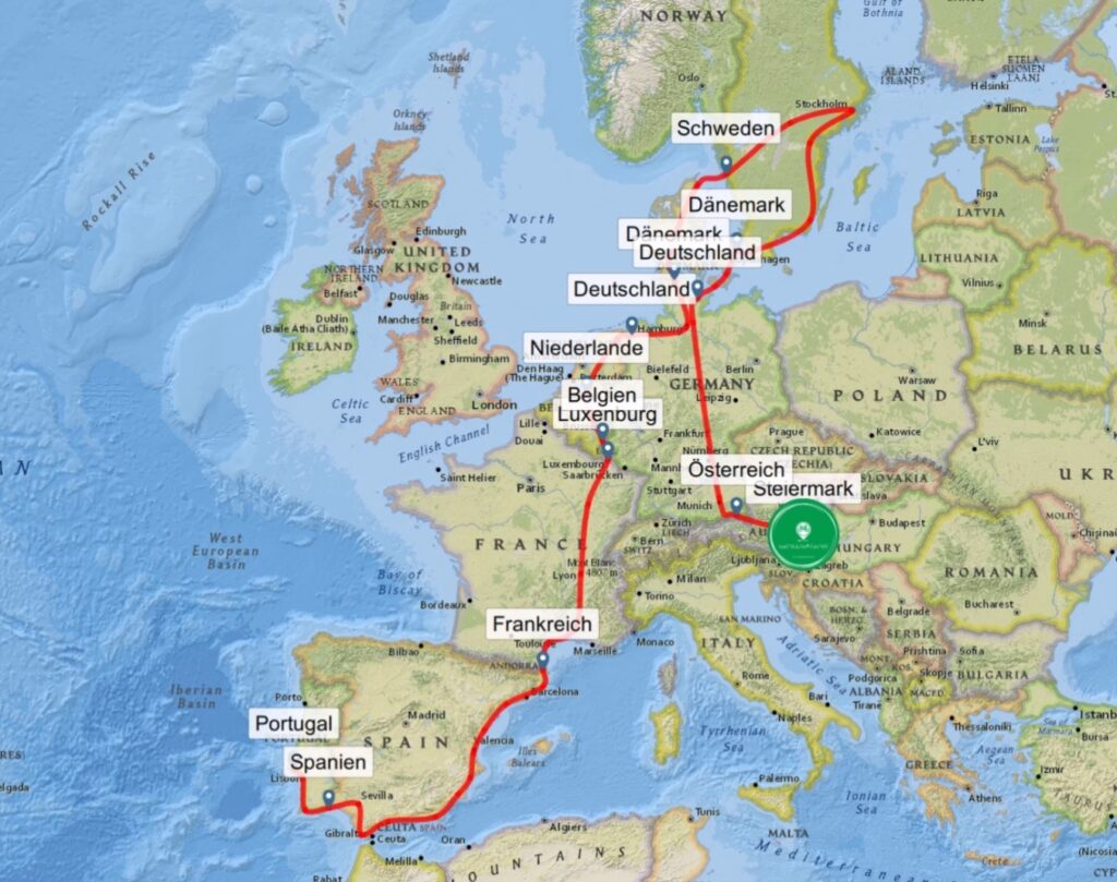 Von Lissabon, Portugal ausgehend entlang der Westküste zum südwestlichsten Punkt Europas, anschließend der Südküste Portugals entlang bis nach Spanien. Der spanischen Mittelmeerküste entlang geht es bis nach Frankreich. Frankreich ist geplant von Süden nach Norden zu durchqueren um dann durch Luxemburg, Belgien, Niederlande, Dänemark bis nach Schweden zu radeln. Von Schweden aus soll es wieder zurück über Dänemark und Deutschlands nach Österreich gehen.